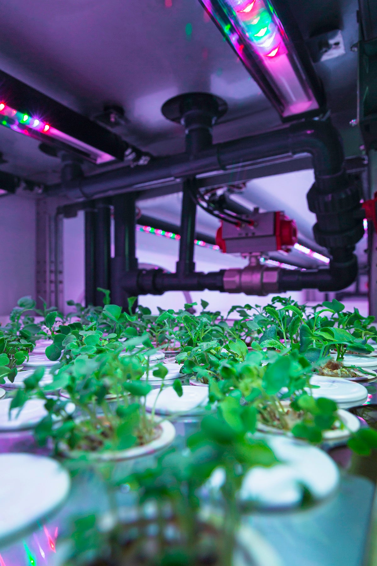 Mit über 30 Anbauschalen (810 Pads pro Schale) mit unabhängiger Bewässerung und Abmessungen von 280 x 80 cm, mit einer gesamten Anbaufläche von über 67 m² und mehr als 24.000 Pads. Die Seitentüren können an einer oder beiden Längsseiten angebracht werden.